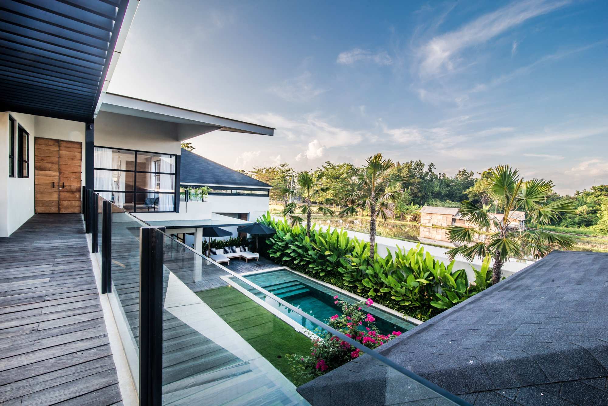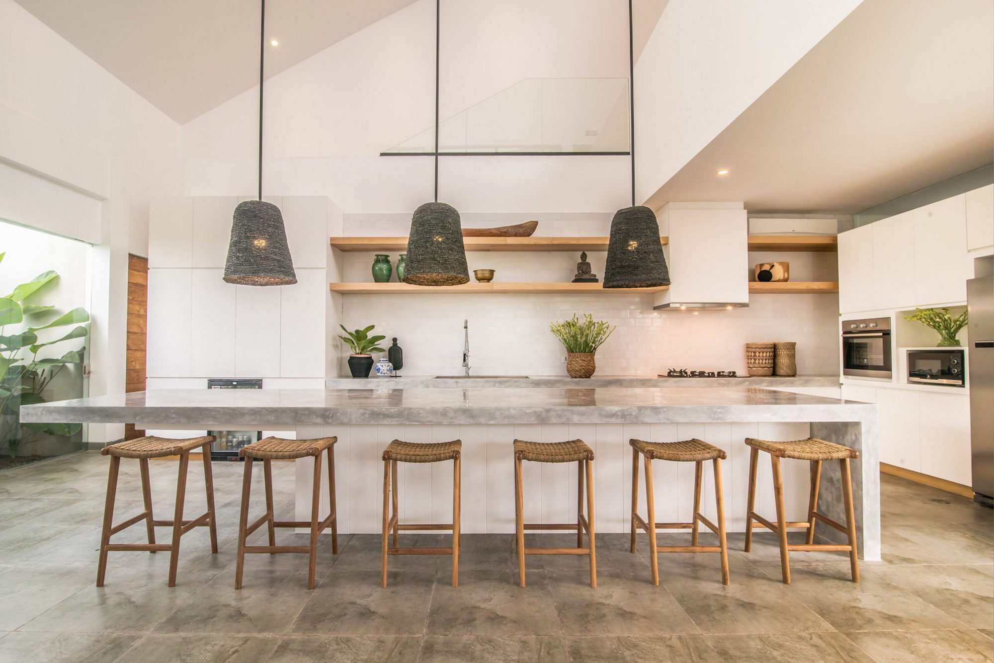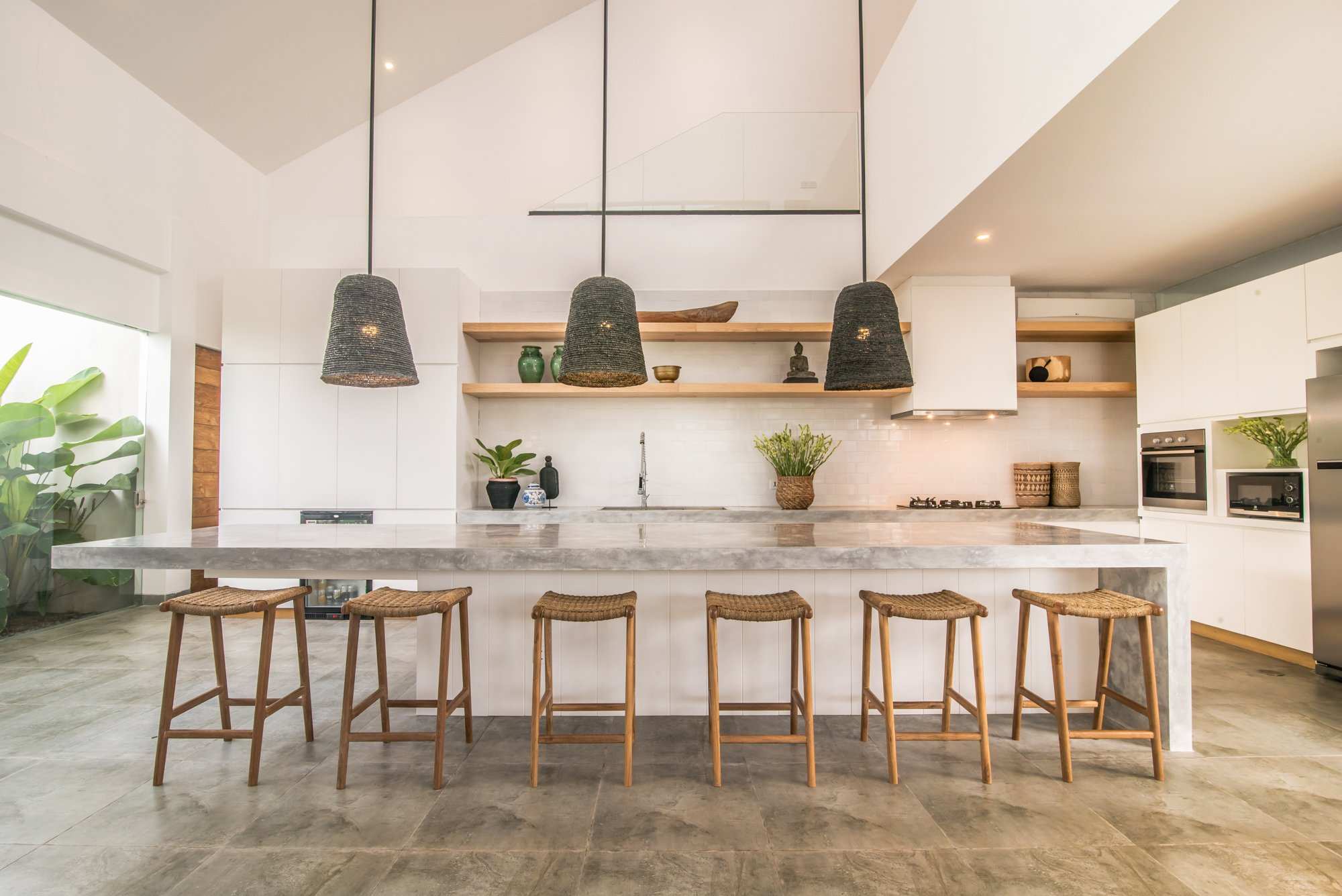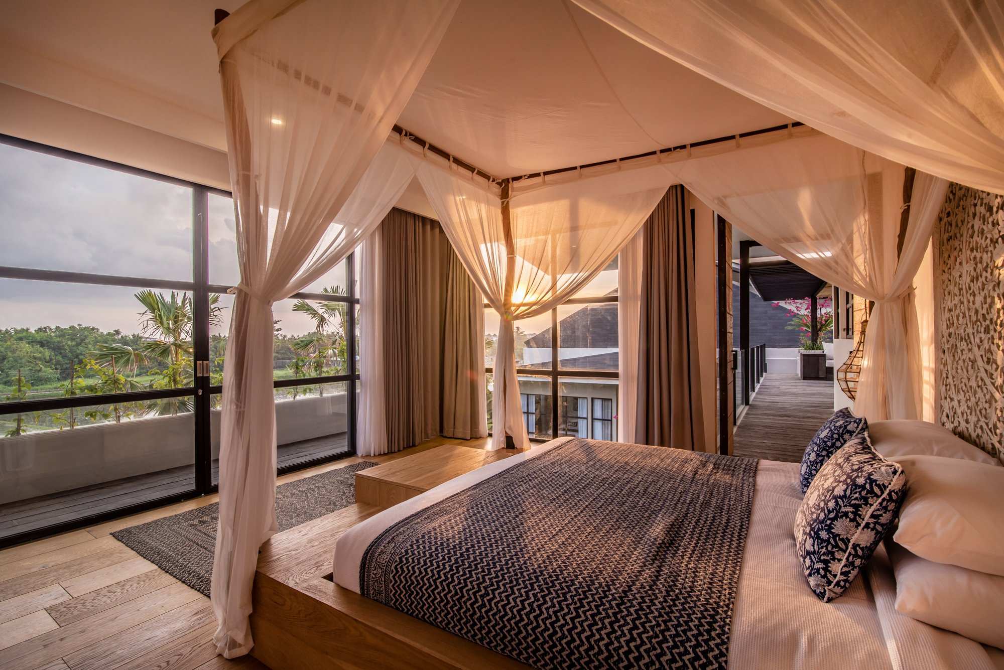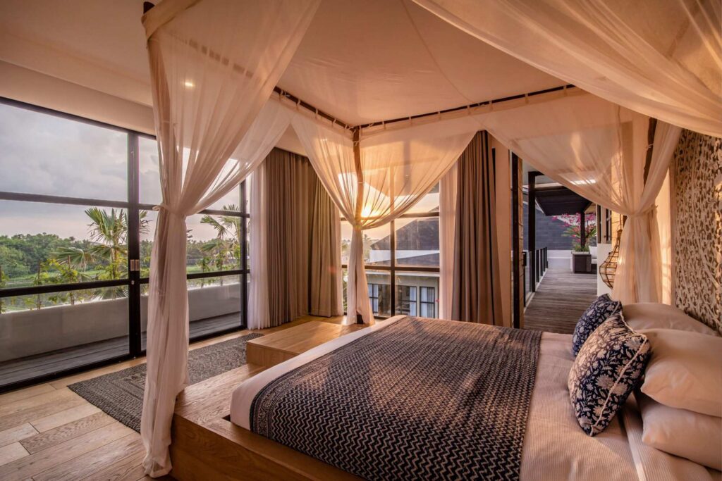 The master bedroom overlooks the rice paddies in front, flooded with natural light with an inviting terrace to enjoy the sunset in the evening. Clean white interiors throughout are punctuated by interesting and intricate accessories whilst plants and greenery bring the outdoors in.
