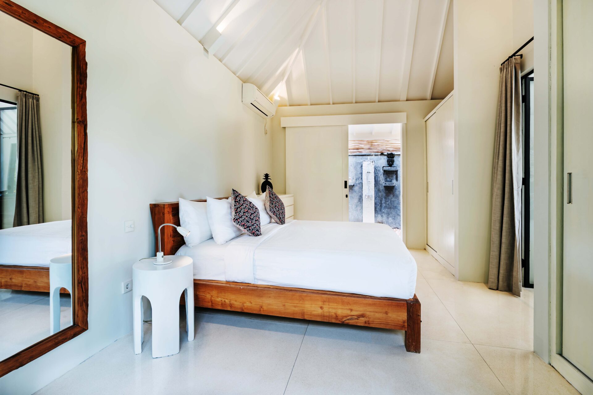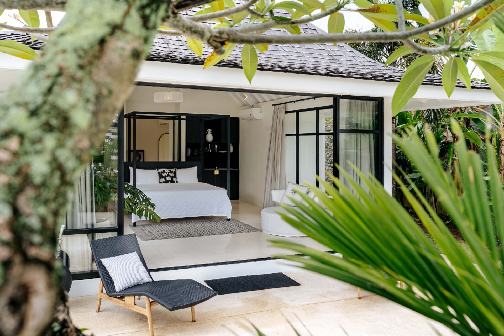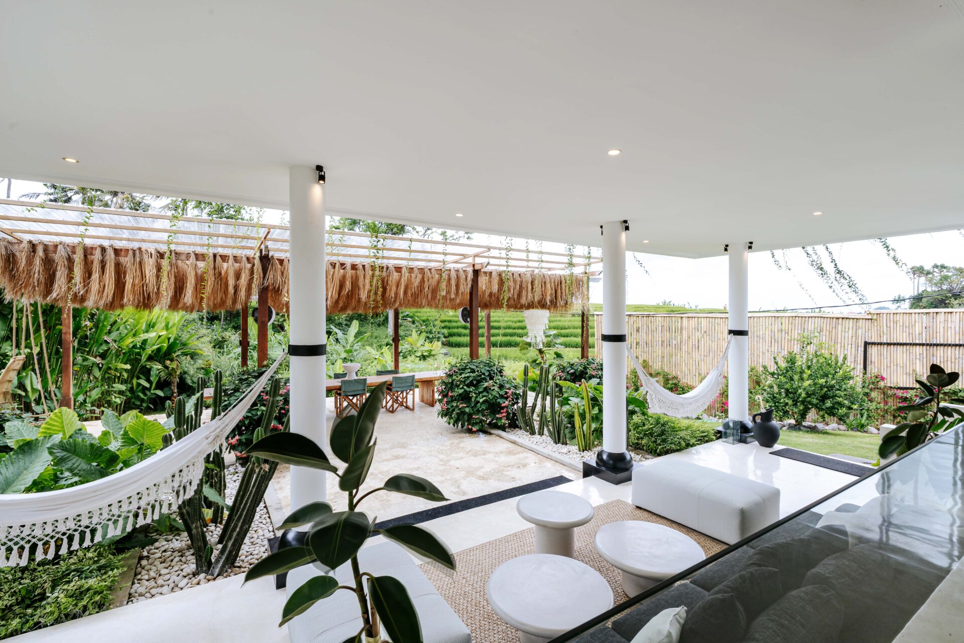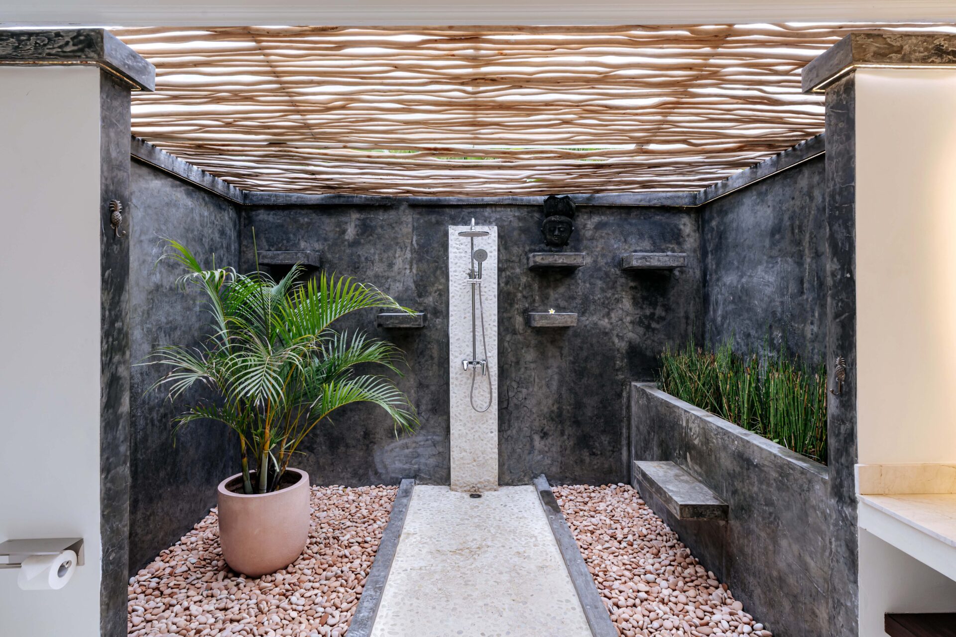 The alfresco dining pavilion is gorgeous, with a dining table for 12 resting under a pergola of hanging rice stems, and cooled by gentle breezes and an overhead fan. Each bedroom comes with an ensuite indoor-outdoor bathroom fitted with a tropical-style rainshower that opens up to the sky in a private courtyard.