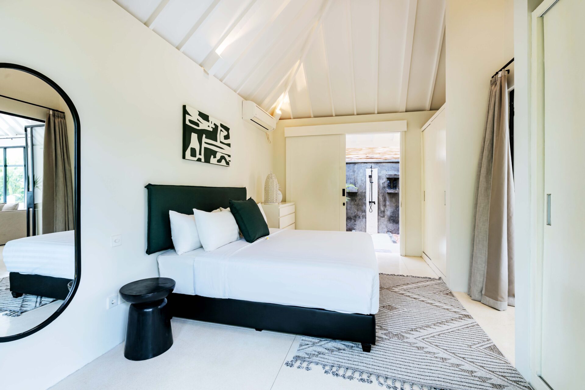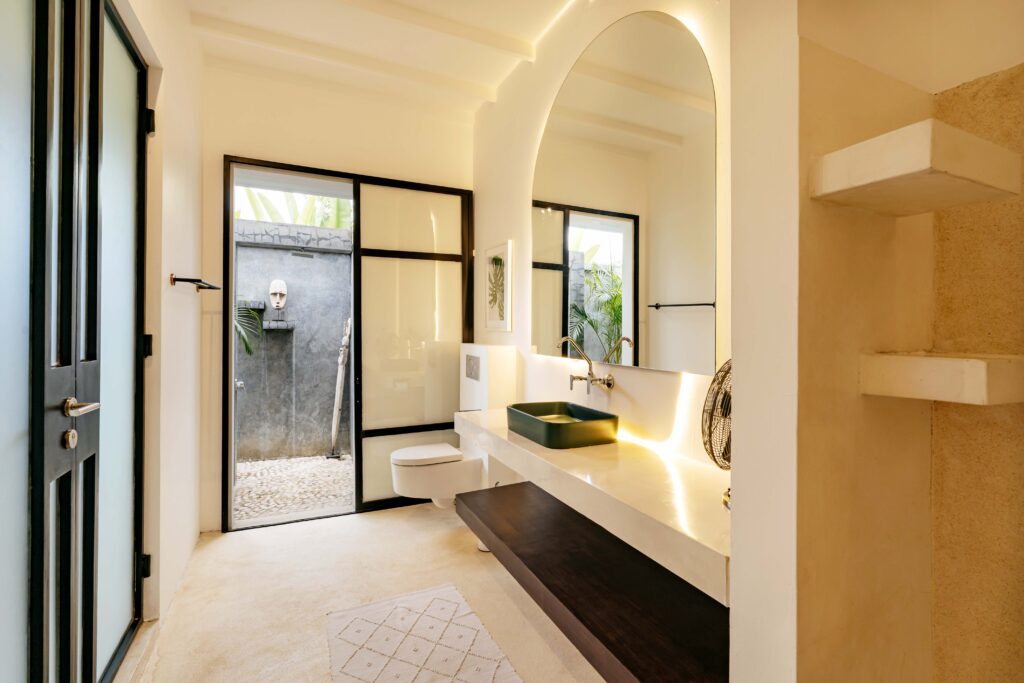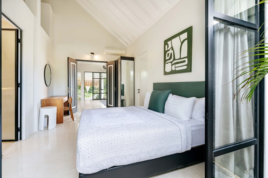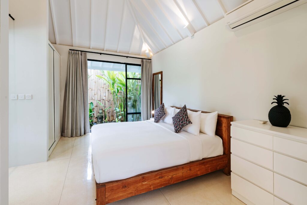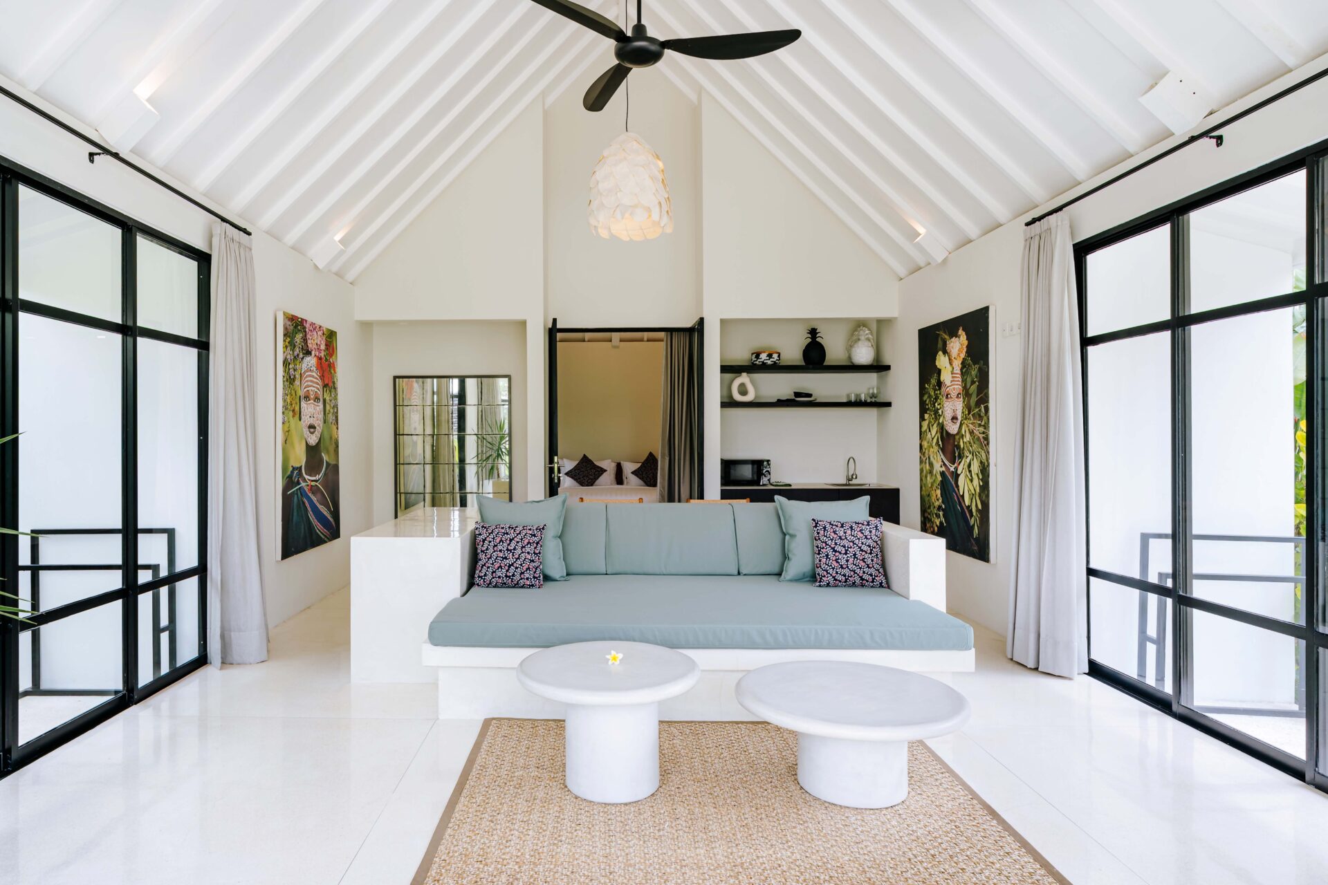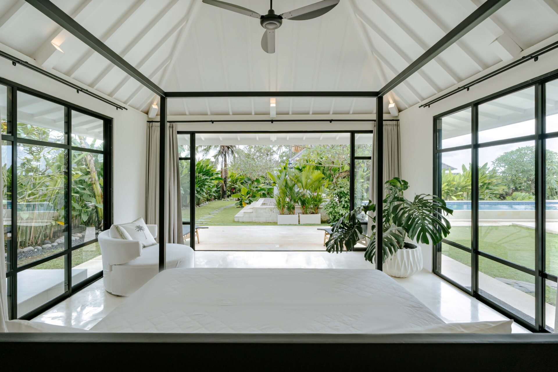 The alfresco dining pavilion is gorgeous, with a dining table for 12 resting under a pergola of hanging rice stems, and cooled by gentle breezes and an overhead fan. Each bedroom comes with an ensuite indoor-outdoor bathroom fitted with a tropical-style rainshower that opens up to the sky in a private courtyard.
