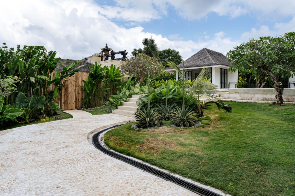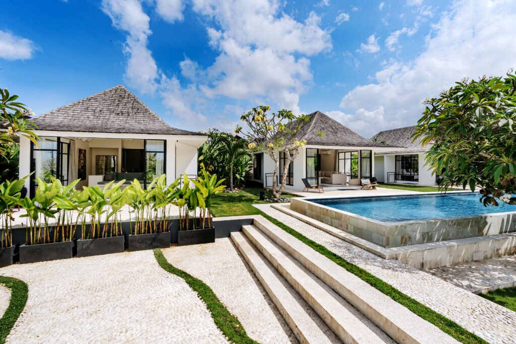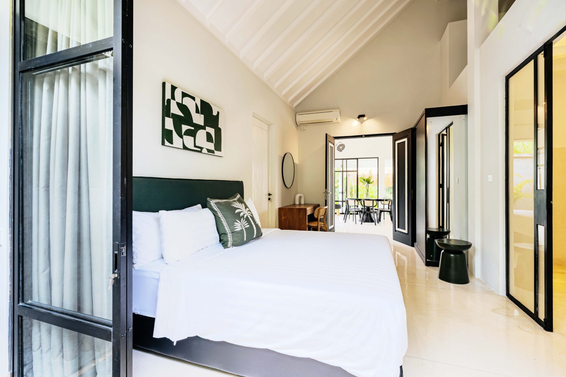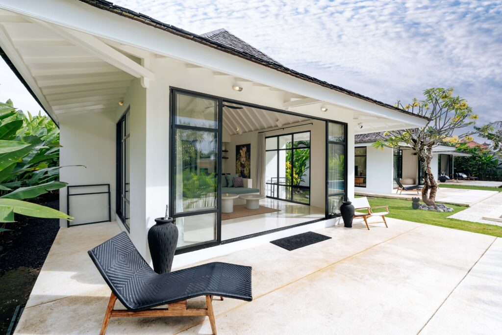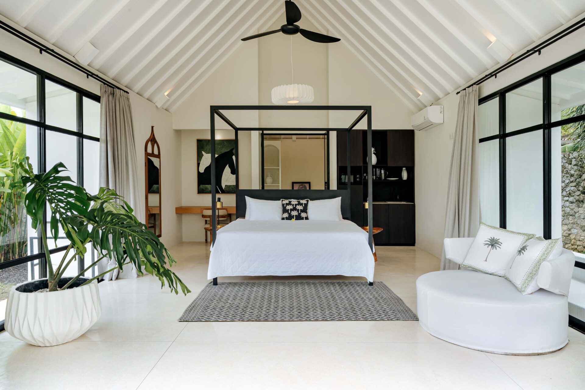 The alfresco dining pavilion is gorgeous, with a dining table for 12 resting under a pergola of hanging rice stems, and cooled by gentle breezes and an overhead fan. Each bedroom comes with an ensuite indoor-outdoor bathroom fitted with a tropical-style rainshower that opens up to the sky in a private courtyard.