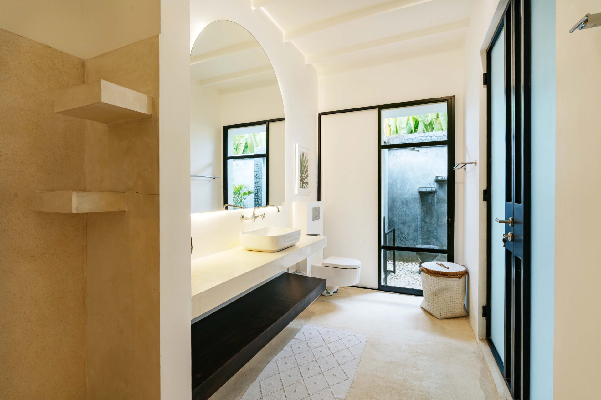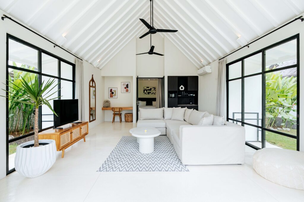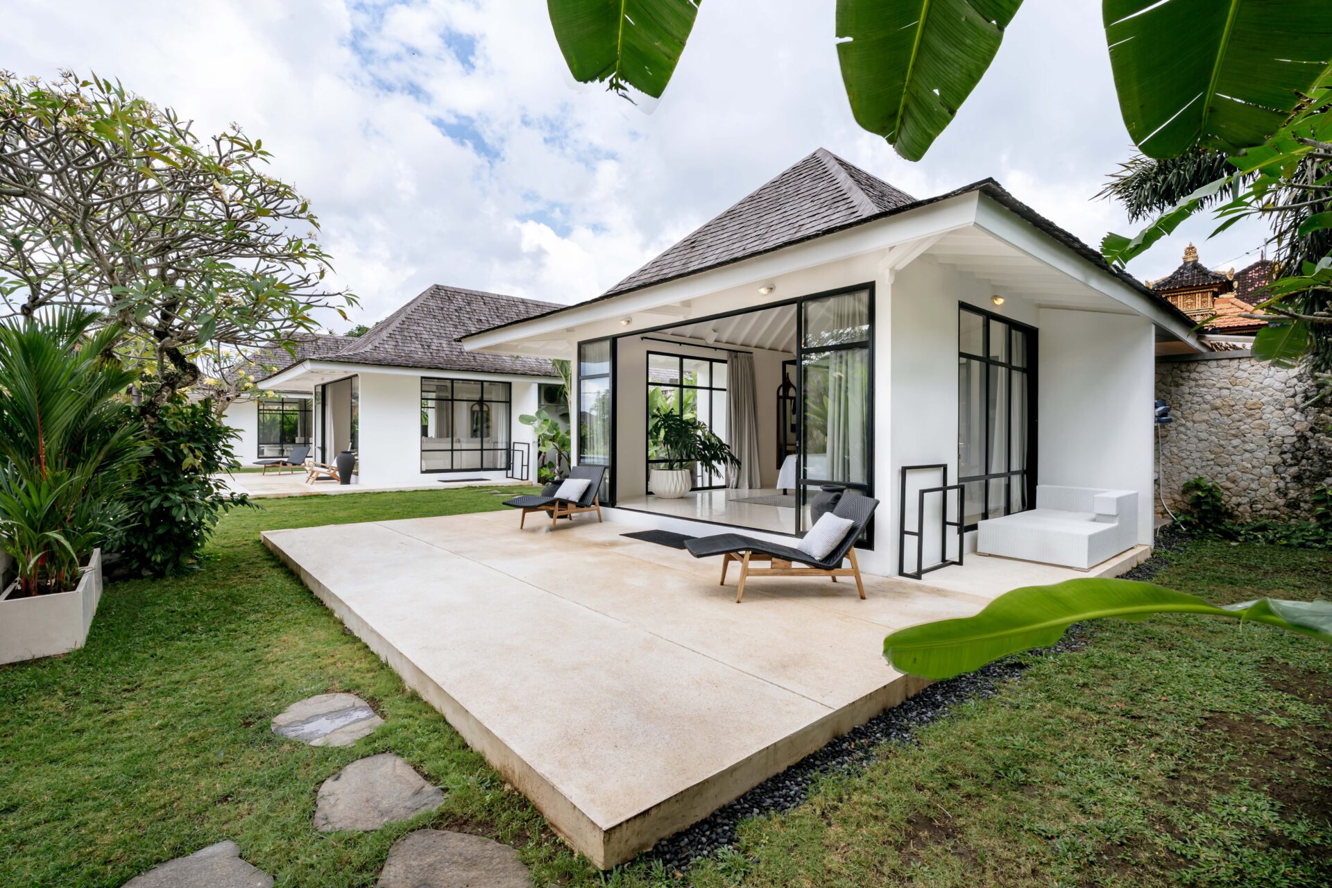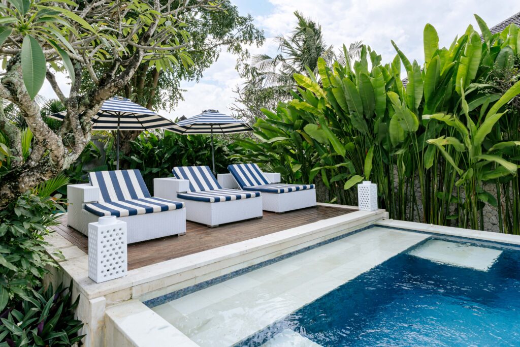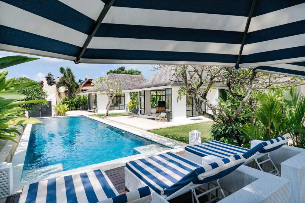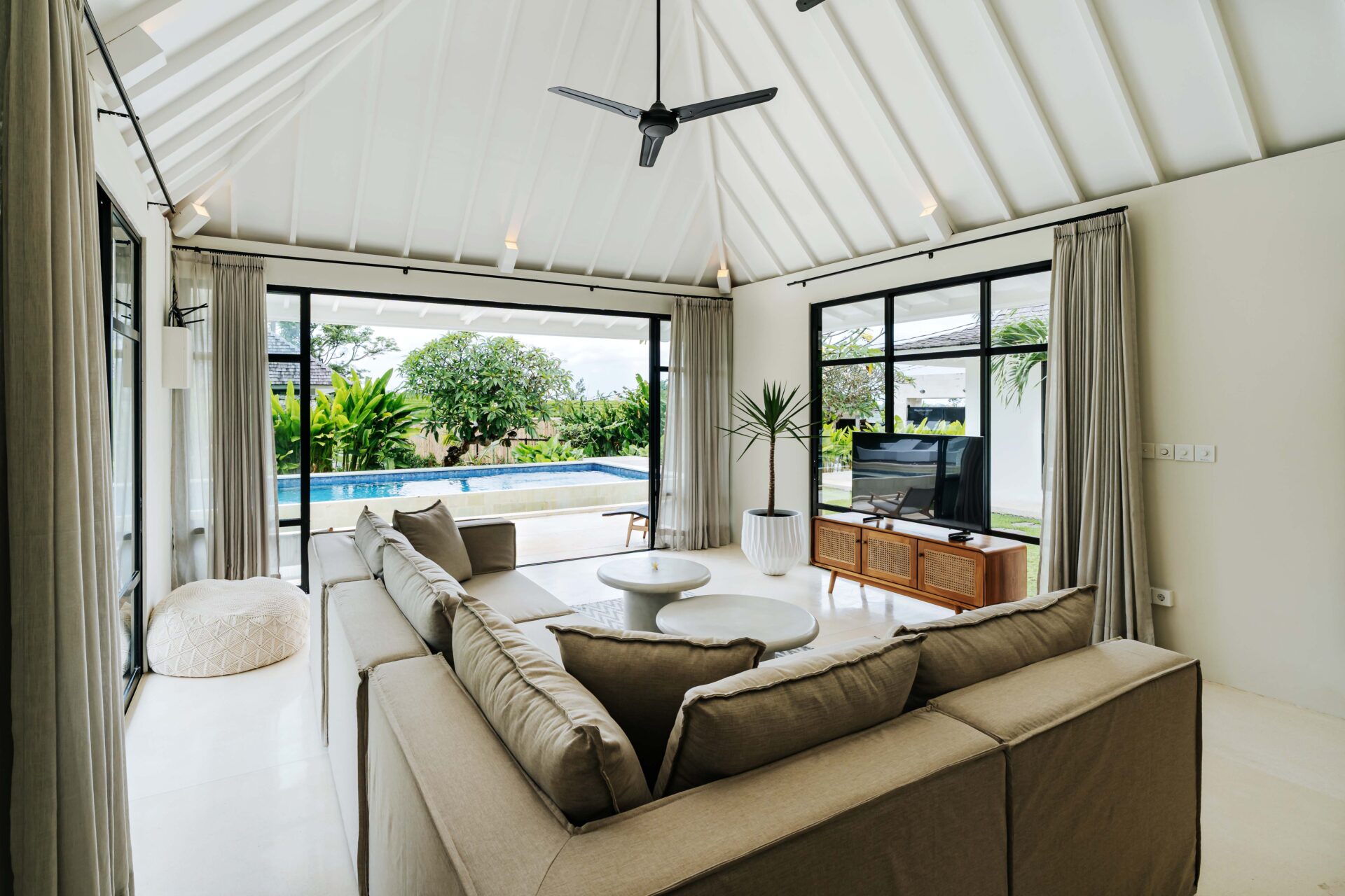 The alfresco dining pavilion is gorgeous, with a dining table for 12 resting under a pergola of hanging rice stems, and cooled by gentle breezes and an overhead fan. Each bedroom comes with an ensuite indoor-outdoor bathroom fitted with a tropical-style rainshower that opens up to the sky in a private courtyard.
