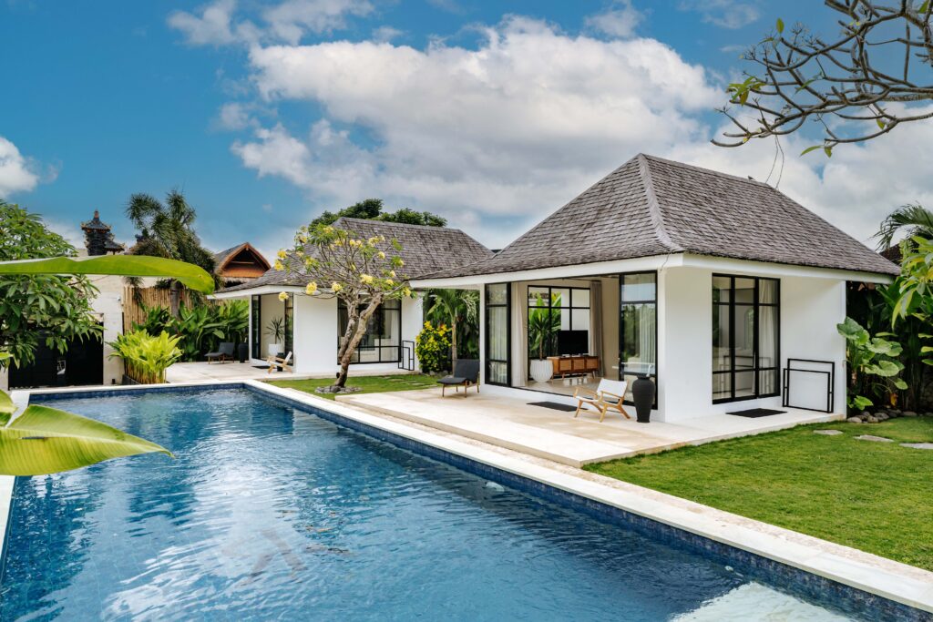 A stunning retreat in Seseh featuring four buildings, a poolside dining gazebo, and private pavilions surrounded by rice fields