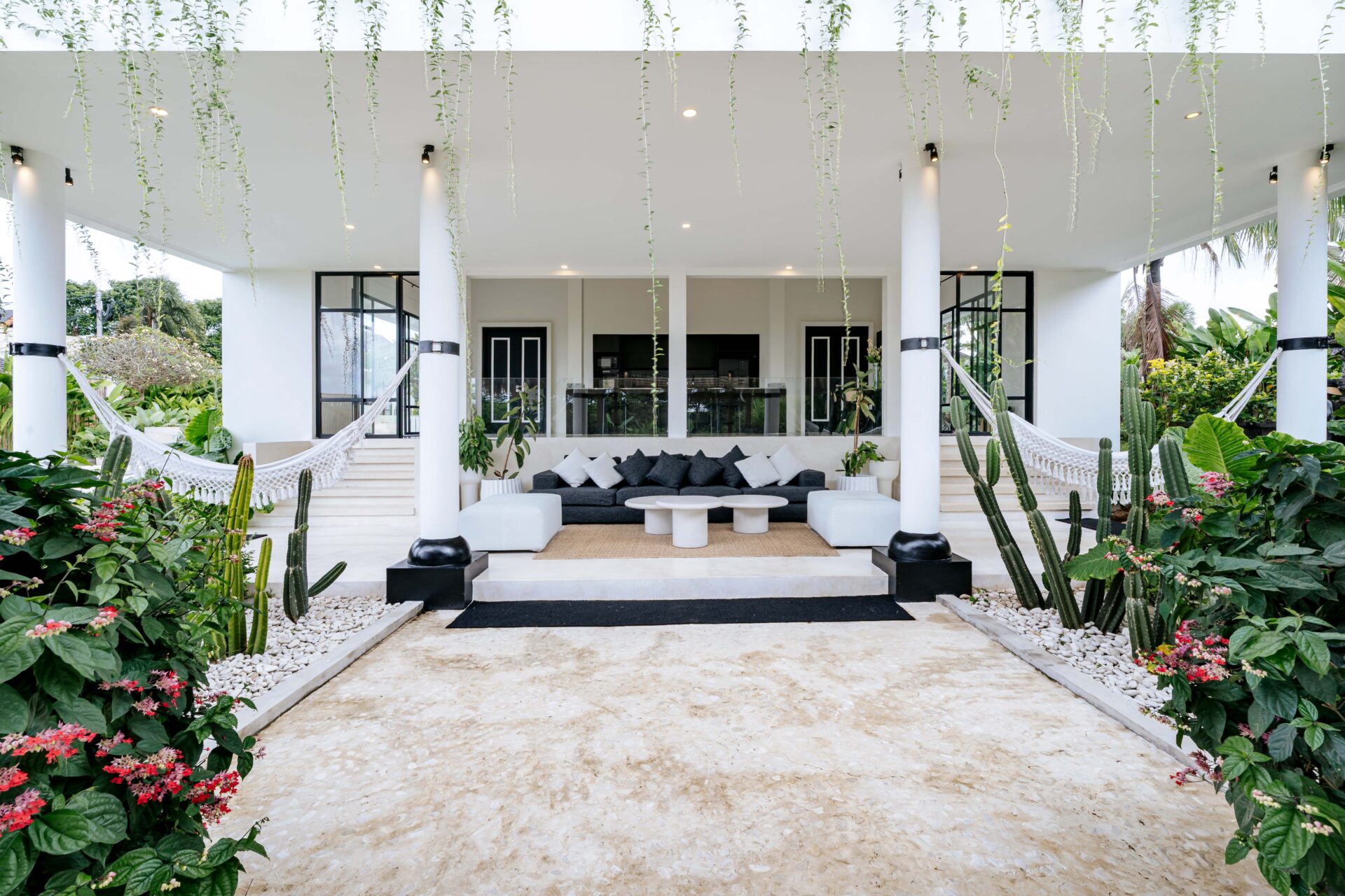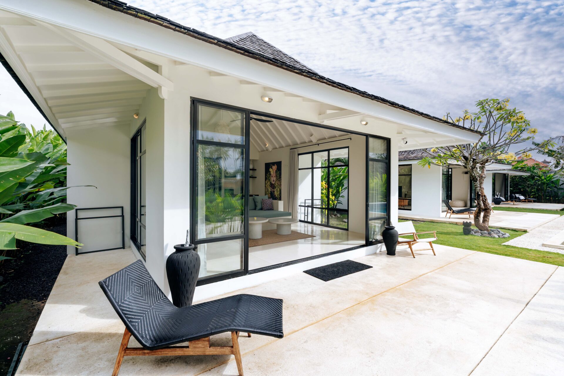 The main house incorporates the living and dining areas, the kitchen, two bedrooms and a rooftop terrace, while a trio of stand alone poolside pavilions house the remaining three bedrooms, complete with their private living areas. The living room is a breezy two-level pavilion, open to the garden on three sides.