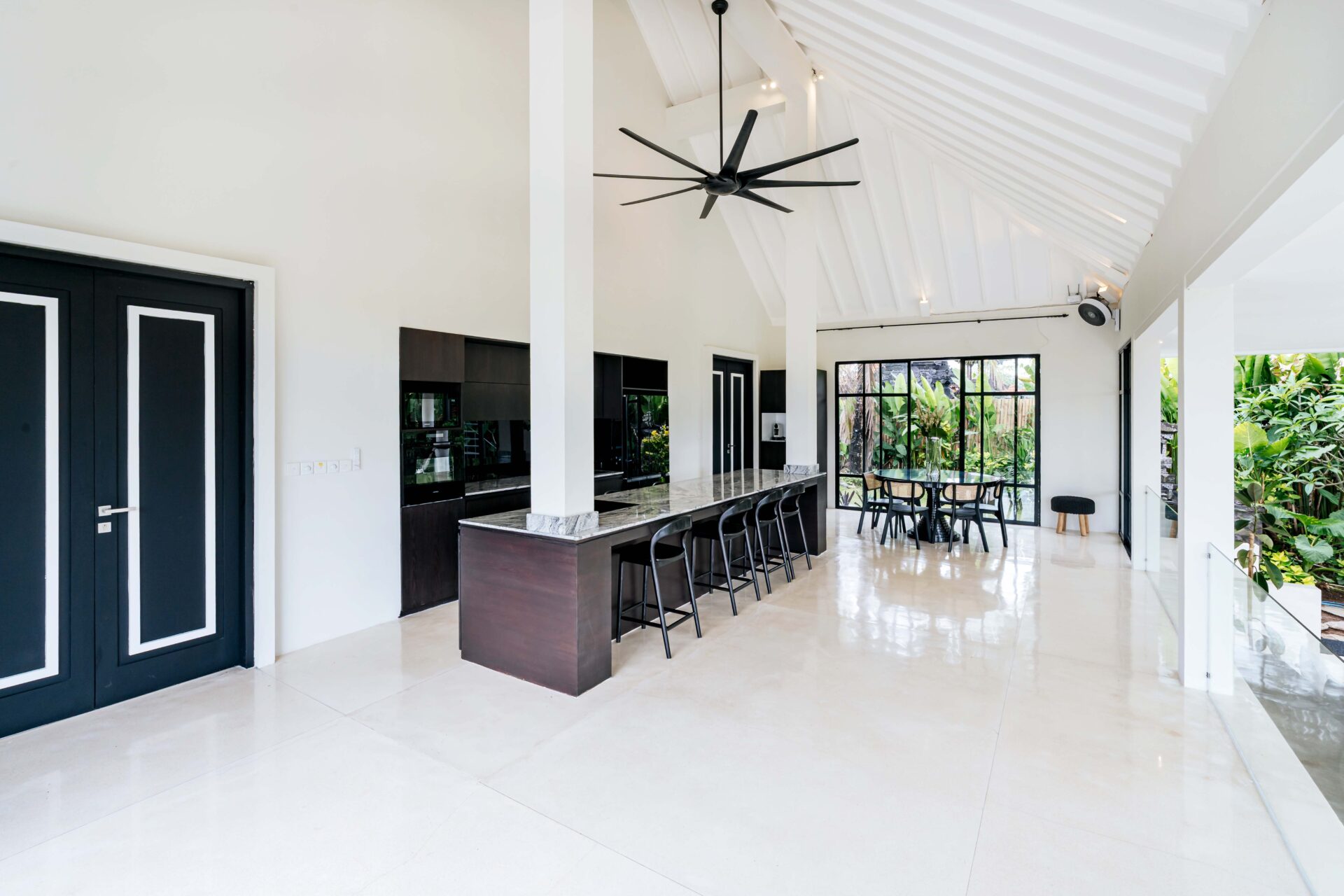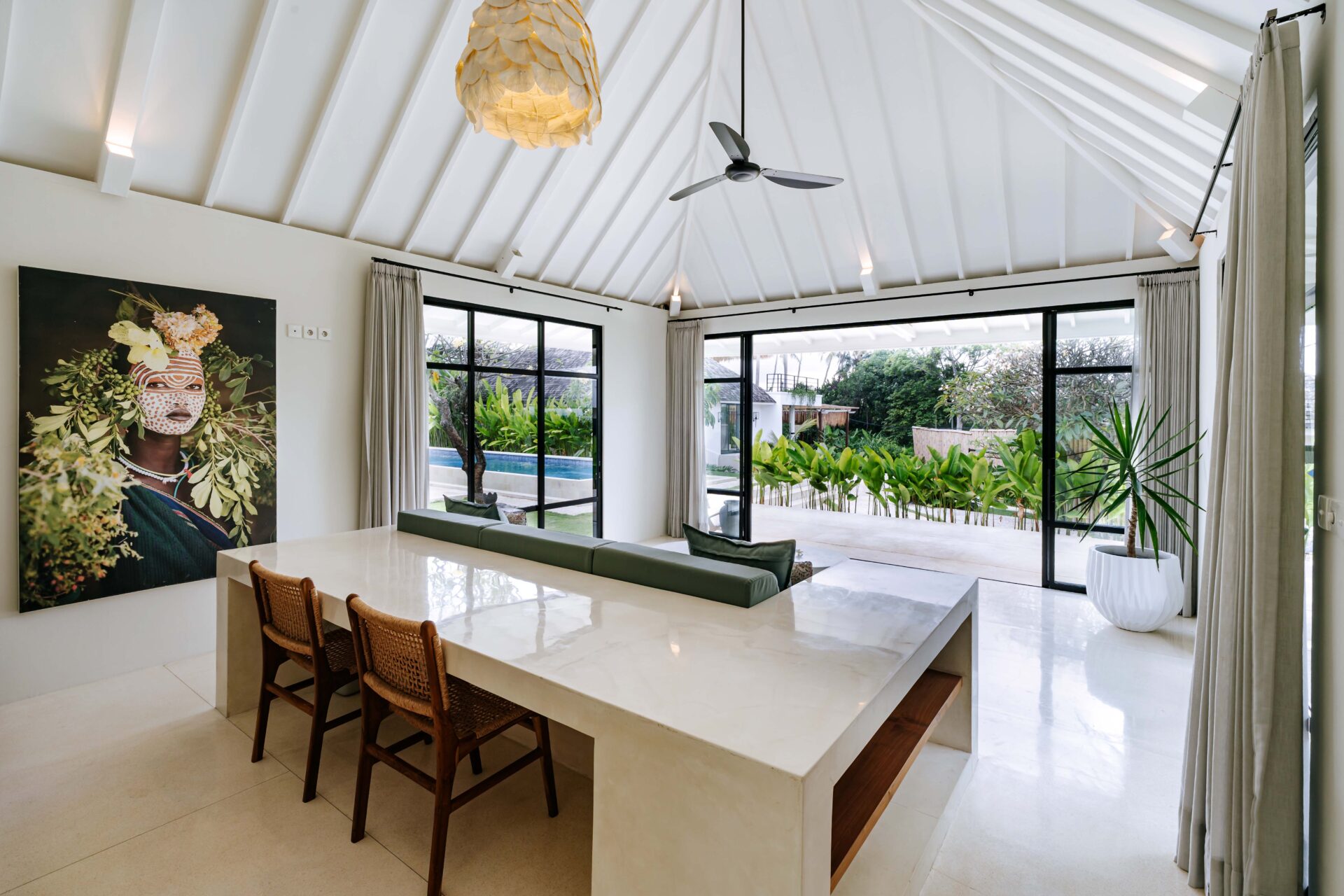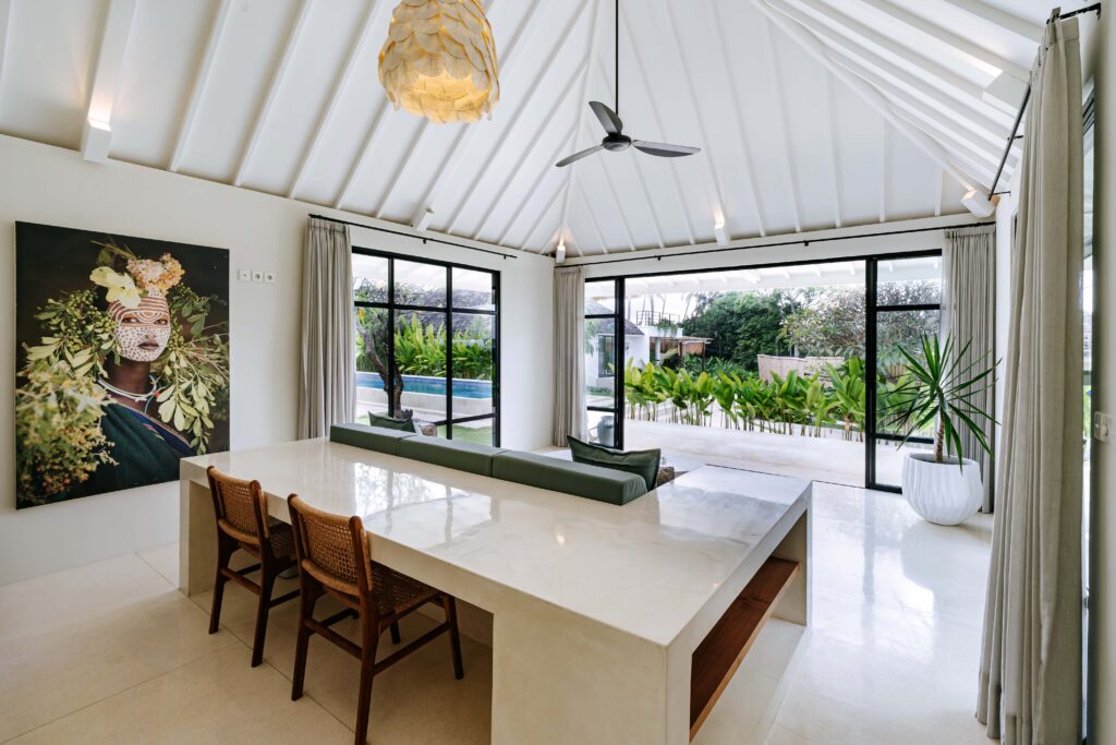 The upper level, accessed by a set of five stone steps on either side of the lounge area, features a welcoming breakfast bar furnished with 6 woven leather highchairs and decorated with a lovingly selected collection of Indonesian artefacts and colourful artwork. The lower level is home to a huge built-in cushioned sofa, oriented towards the glorious view of greenery.