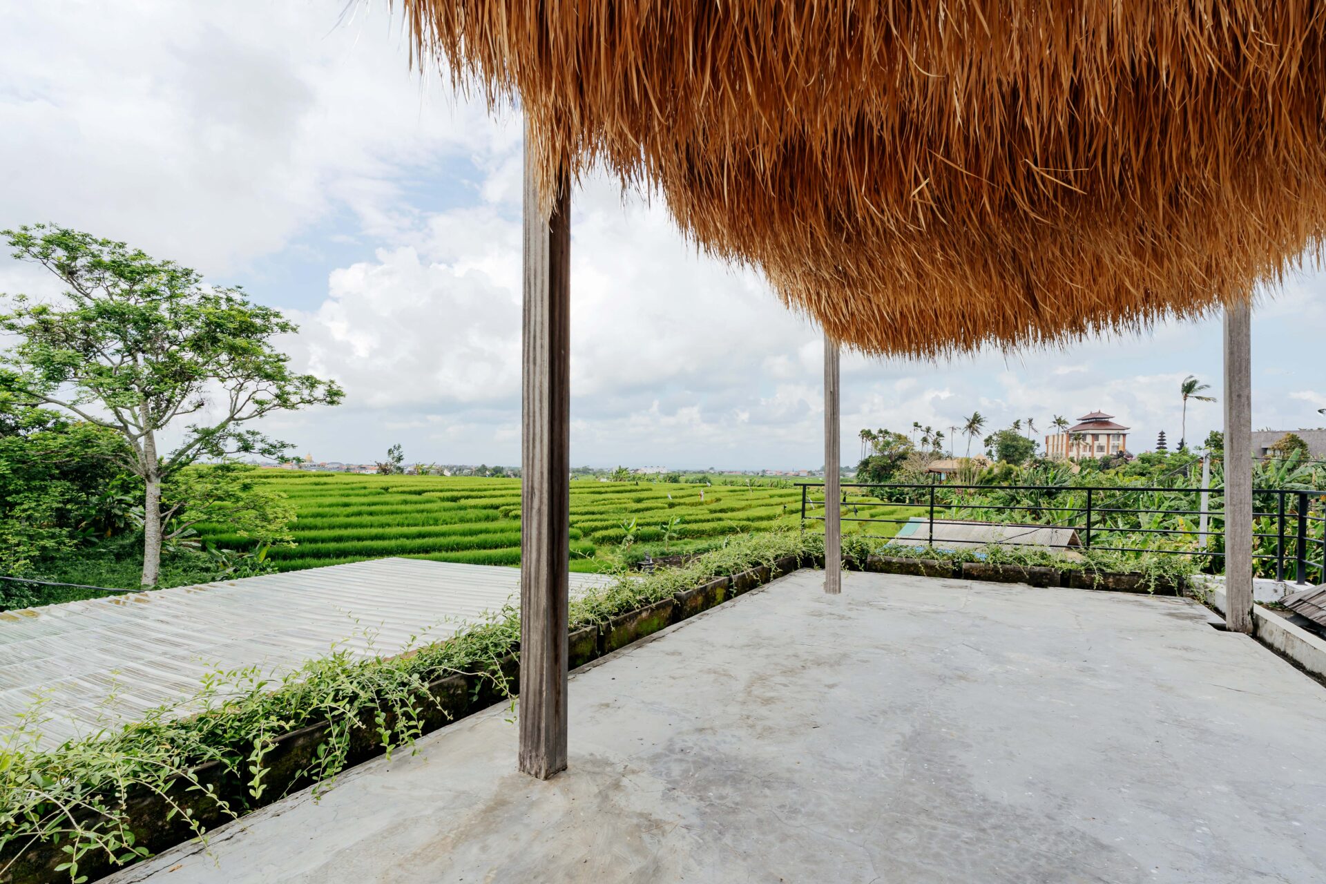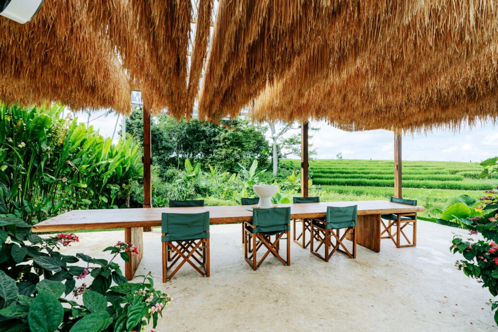 A spiral staircase leads up to the rooftop terrace, which is shaded by a canopy of swaying rice stalks in a true reflection of the surrounding agricultural landscape.