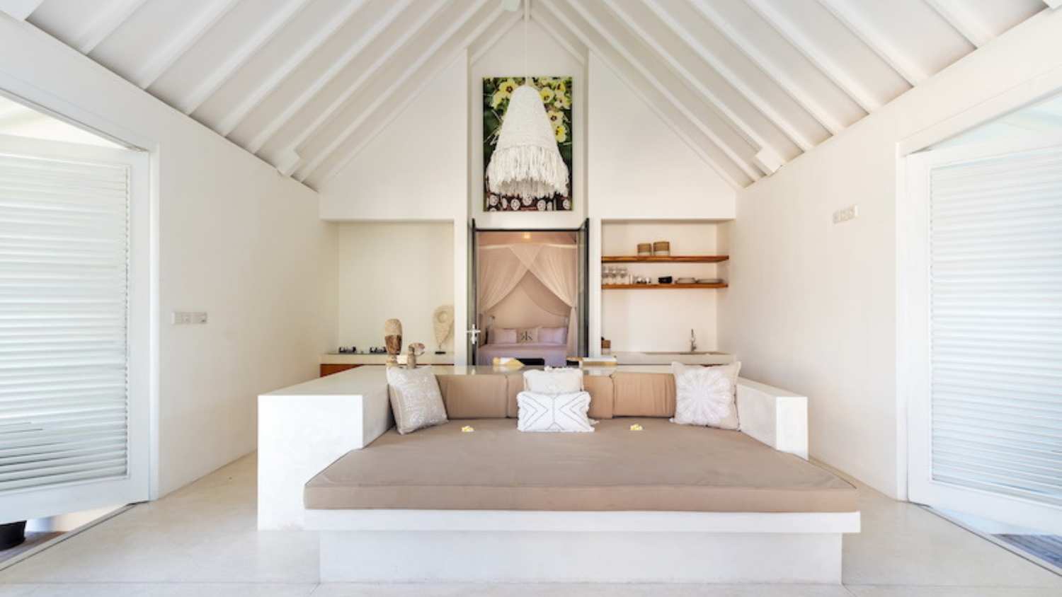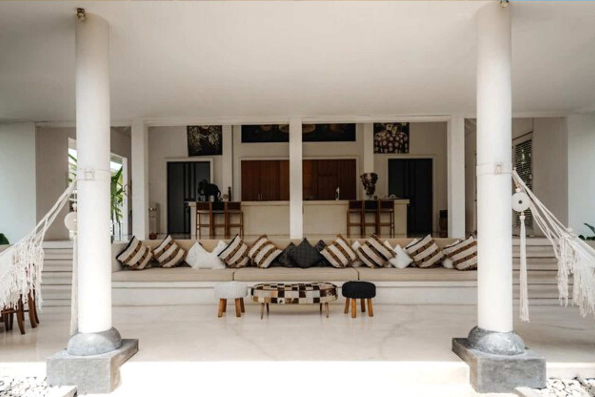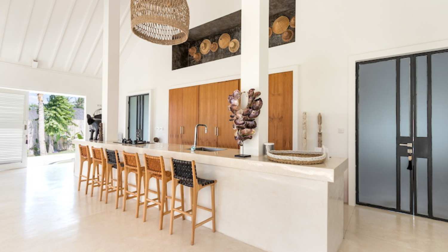 The upper level, accessed by a set of five stone steps on either side of the lounge area, features a welcoming breakfast bar furnished with 6 woven leather highchairs and decorated with a lovingly selected collection of Indonesian artefacts and colourful artwork. The lower level is home to a huge built-in cushioned sofa, oriented towards the glorious view of greenery.