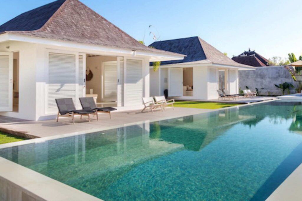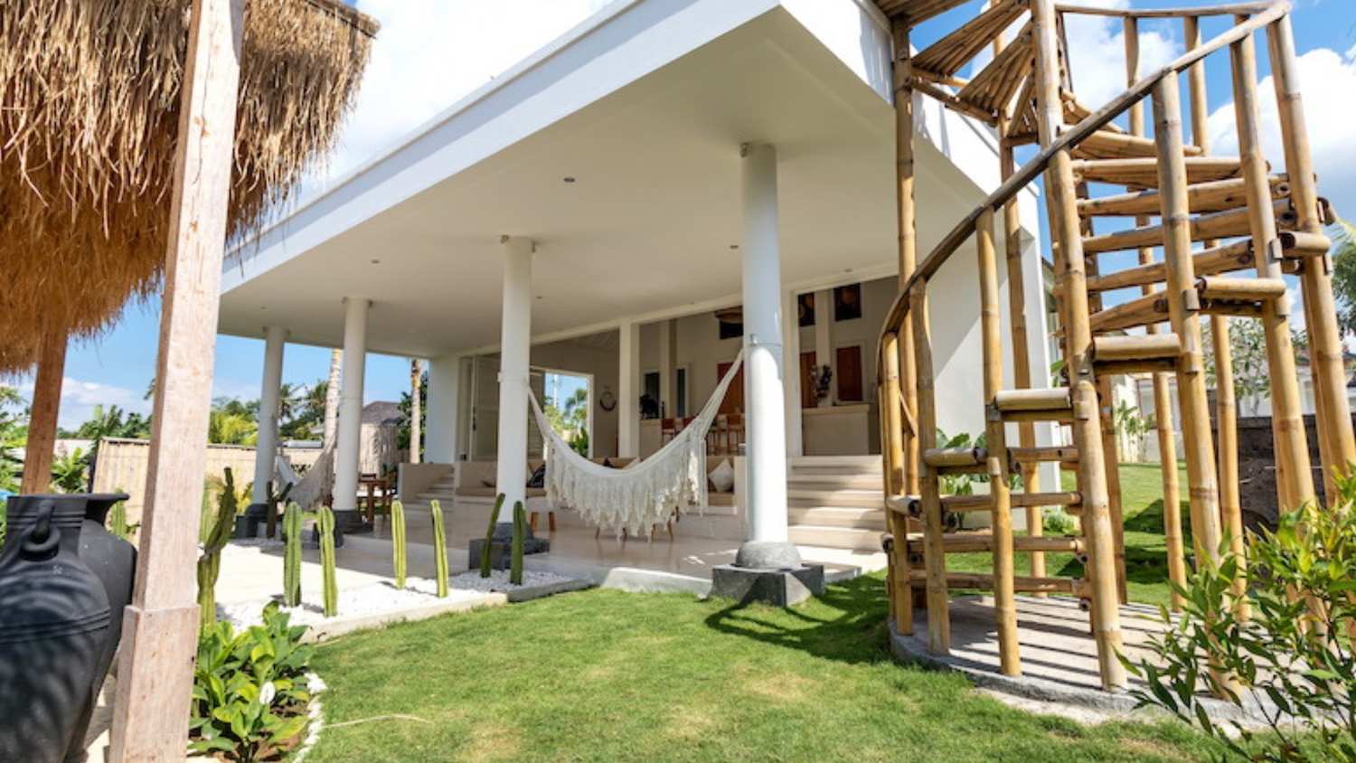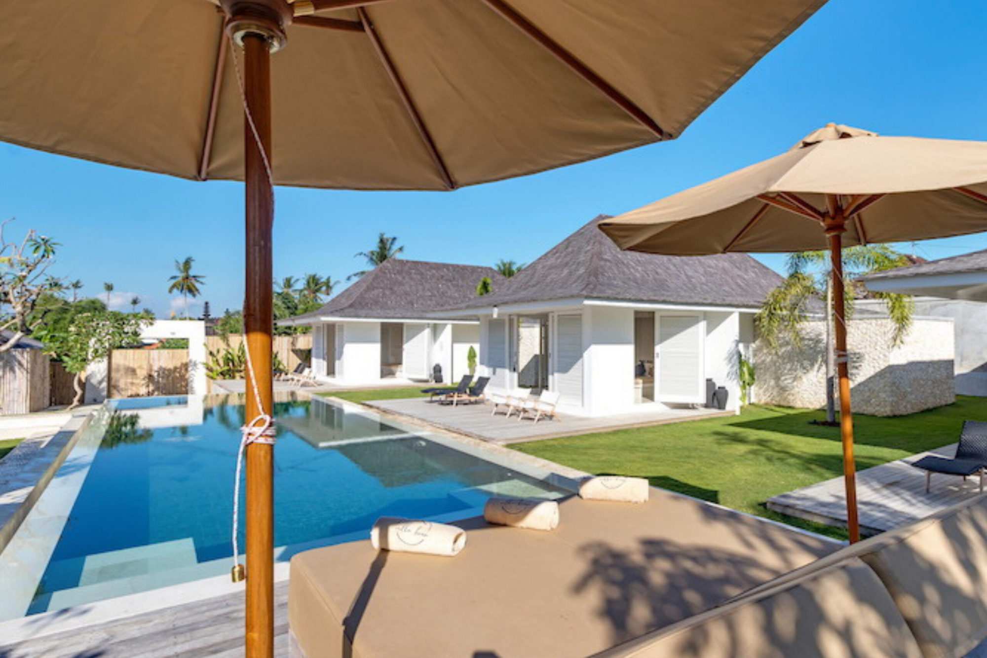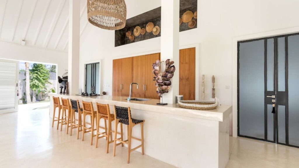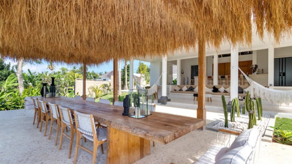 The alfresco dining pavilion is gorgeous, with a dining table for 12 resting under a pergola of hanging rice stems, and cooled by gentle breezes and an overhead fan. Each bedroom comes with an ensuite indoor-outdoor bathroom fitted with a tropical-style rainshower that opens up to the sky in a private courtyard.