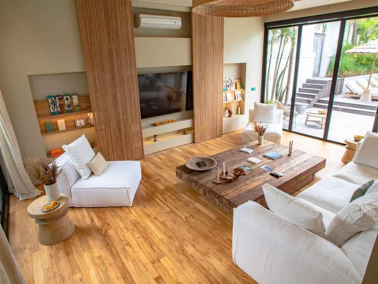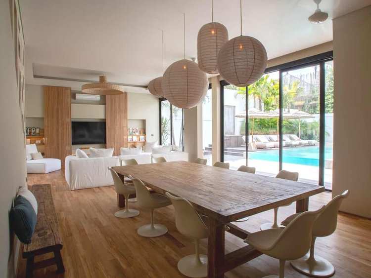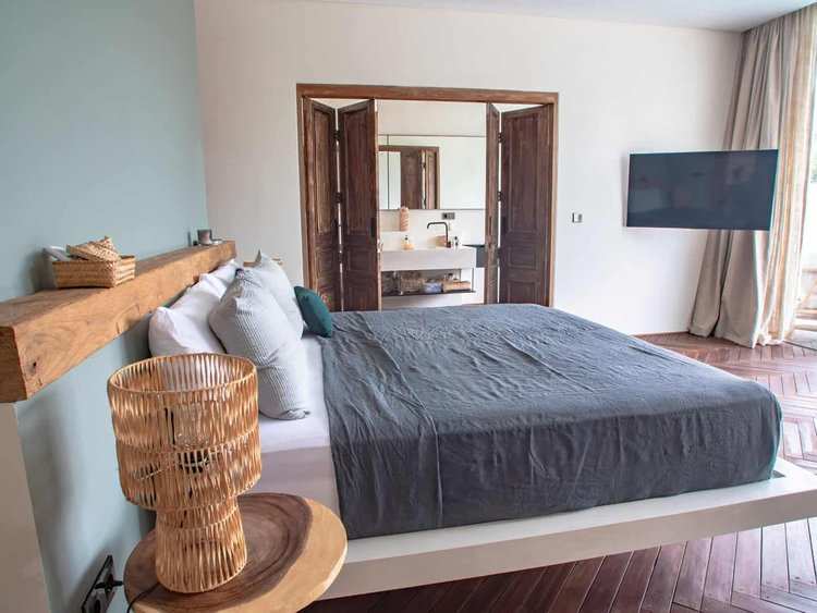 The sitting room is open plan with large comfy sofas and wooden sliding cupboard doors to hide the modern electronics of today and keep the feeling neutral and natural. Impressive doors lead from one room to another, parque flooring and floor to ceiling windows compliment the fabulous proportions throughout. Four large double bedrooms, each with their own bathrooms, two upstairs with balconies and a roof terrace that could be made into useable space if an incoming buyer wished. The two bedrooms on the ground floor come off the sitting room and look out over the pool area.