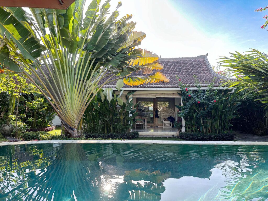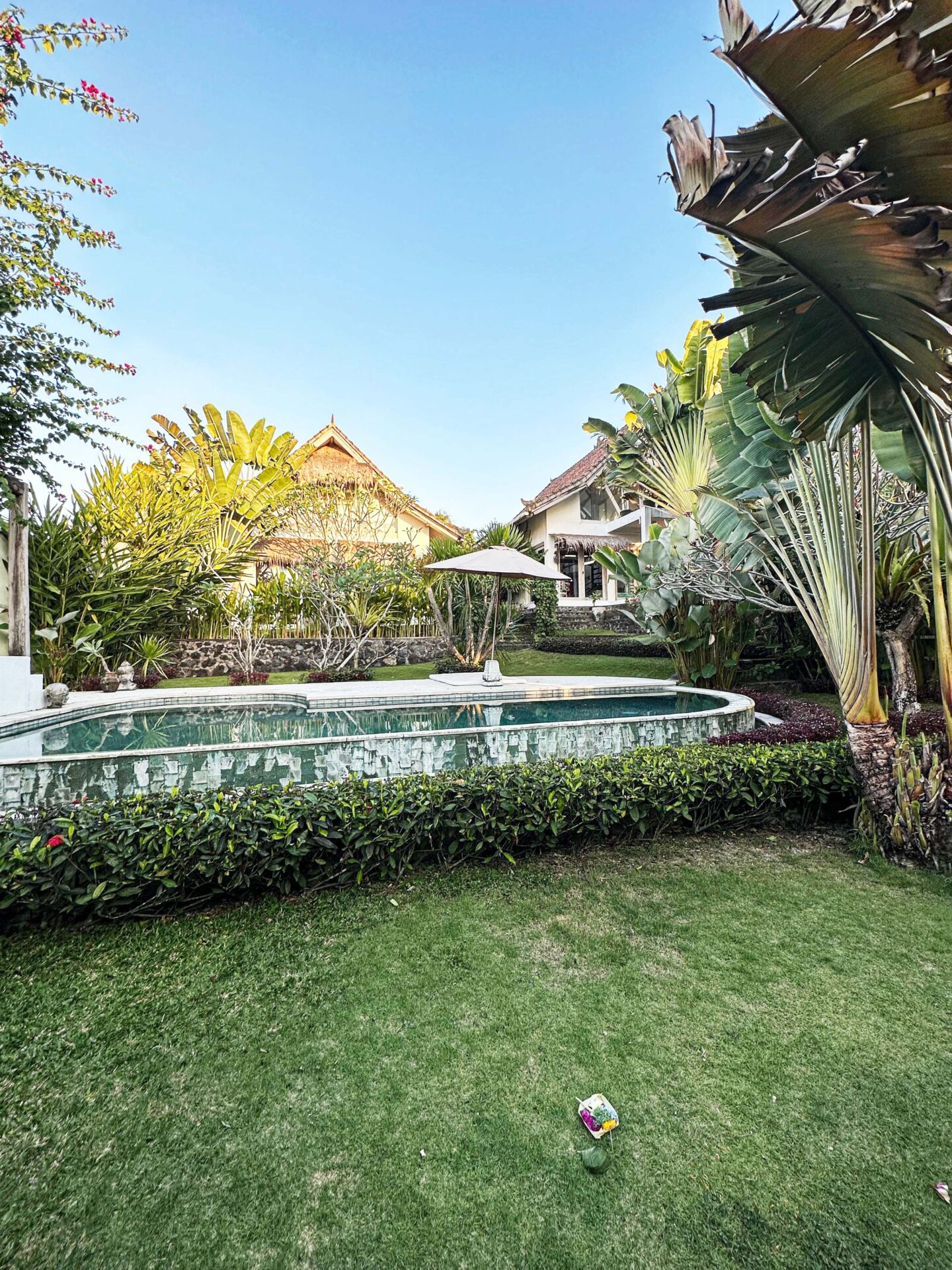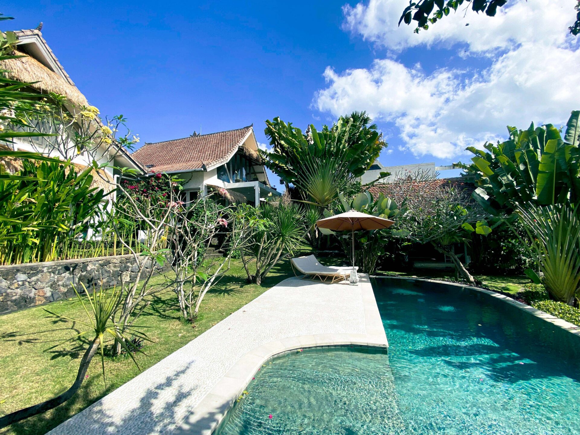Sitting tucked away in Tumbak Bayu on 11 are of mature gardens and undulating land this villa was created by its owners as a tropical home offering a passive income with four self contained studios in the garden and a pool in the middle.