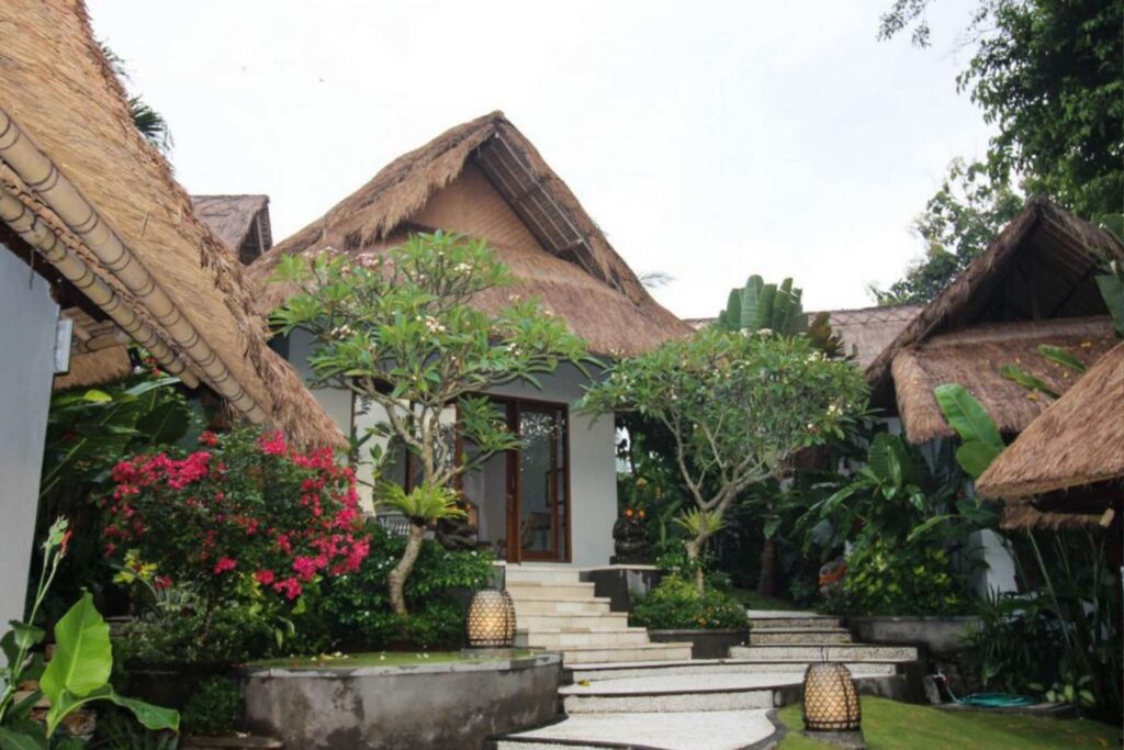 Four-bedroom villa set in a dramatic landscape overlooking a flowing river and with views of an ancient temple, partially renovated in keeping with the Old Bali style, retaining magic and charm.