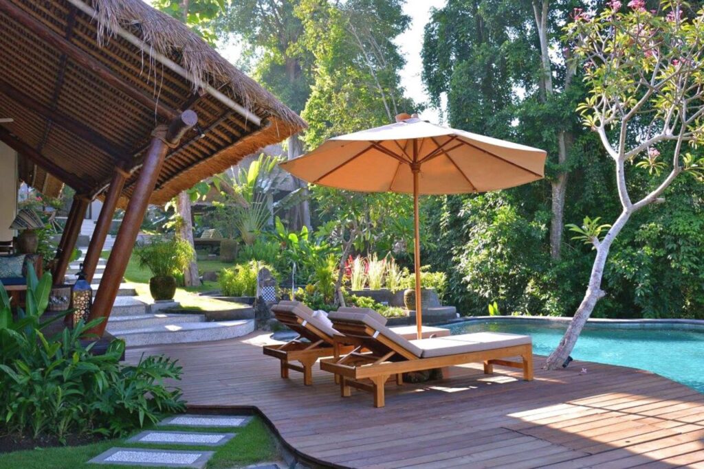 Set in a dramatic landscape overlooking a flowing river and with views of an ancient temple, this villa has been partially renovated in keeping with the Old Bali style, retaining magic and charm. The villa has four bedrooms, two of which are interconnecting, and the master has stairs up to what could be an office overlooking a beautiful temple amongst the trees ahead, or this space could be used as a gym, yoga spot or children’s playroom or bedroom (there is no air con but there is sufficient breeze being high up in the trees as well as a fan). (All bedrooms do have aircon). Three of the four bedrooms have king-sized beds, one has two large singles and all have dedicated bathrooms with rain showers, two have baths.