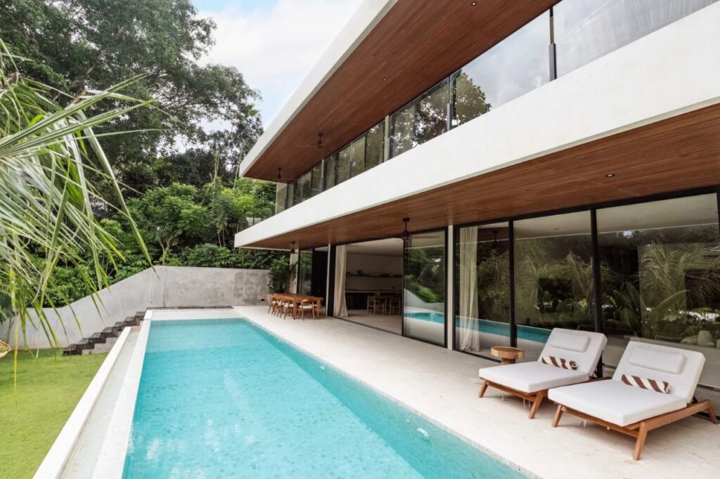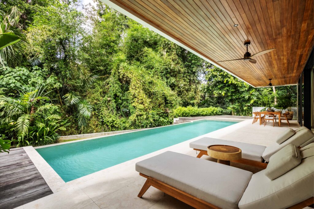 Indoor living blends seamlessly with outdoor leisure. Step onto the expansive terrace, where an infinity pool overlooks lush jungle views, and enjoy a sun-drenched patio and sunken lounge—ideal for entertaining or quiet relaxation. The terrace also provides an inspiring setting for yoga or other outdoor activities.